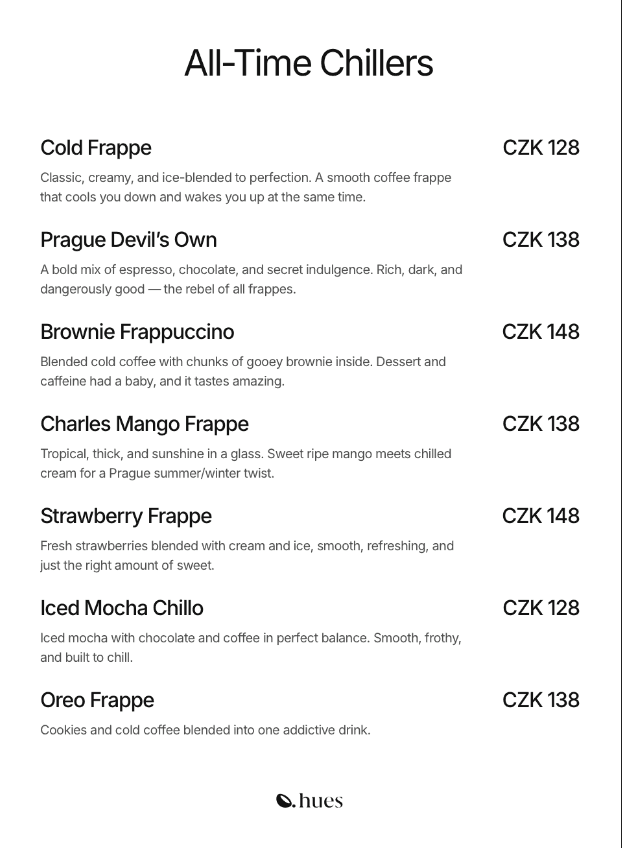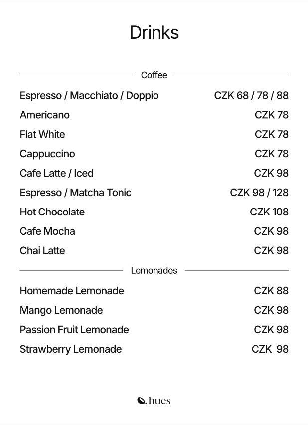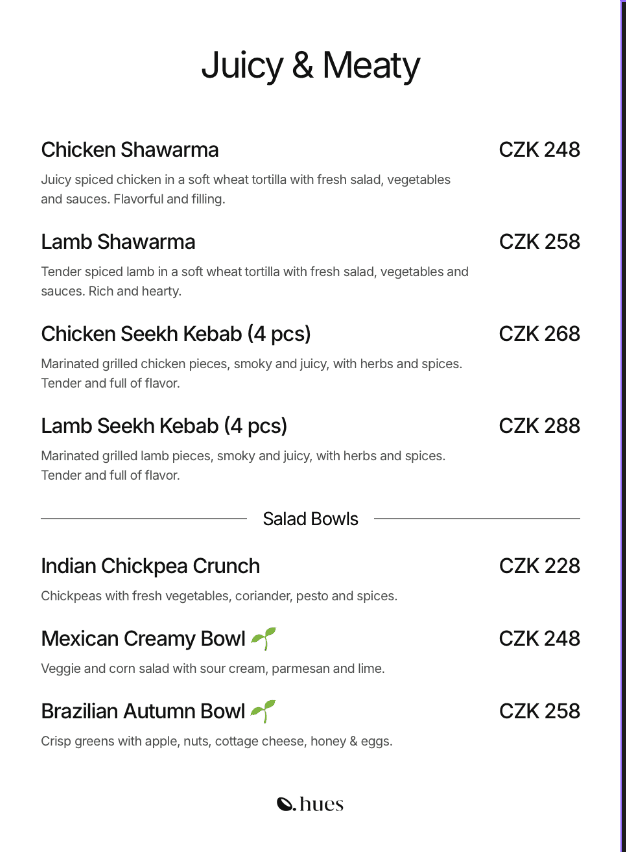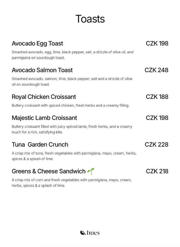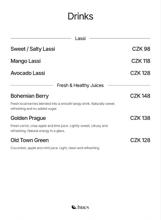 Hues Kafe is the first Indian café in Old Town Prague inspired by Bombay’s classic cafés. We serve global café dishes with Indian comfort flavors from breakfast plates and toasts to chaat, shawarmas and desserts, all made fresh daily with real ingredients and no deep frying. Alongside specialty coffee, chai, juices and herbal teas, it’s a warm space for locals and travelers that also hosts emerging artists. Founded in 2025 by an Indian designer Sameer Shaikh, Hues Kafe was built from scratch to offer light, honest food, a calm atmosphere and a place that feels like more than just a meal.